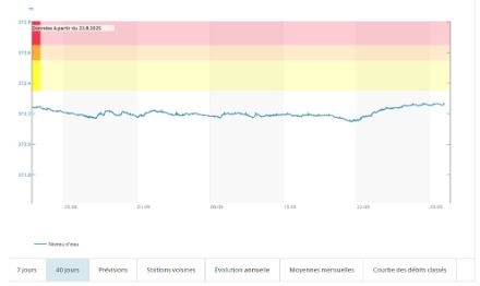 Quant aux lacs de Neuchâtel, Bienne et Morat, ils affichent tous trois des valeurs normales pour la saison. L’évolution du niveau du lac de Neuchâtel à la station de Neuchâtel montre une nette tendance à la baisse entre fin août et mi-septembre – probablement consécutive à la brève sécheresse de fin d’été – suivie d’une stabilisation sur les 20 derniers jours.